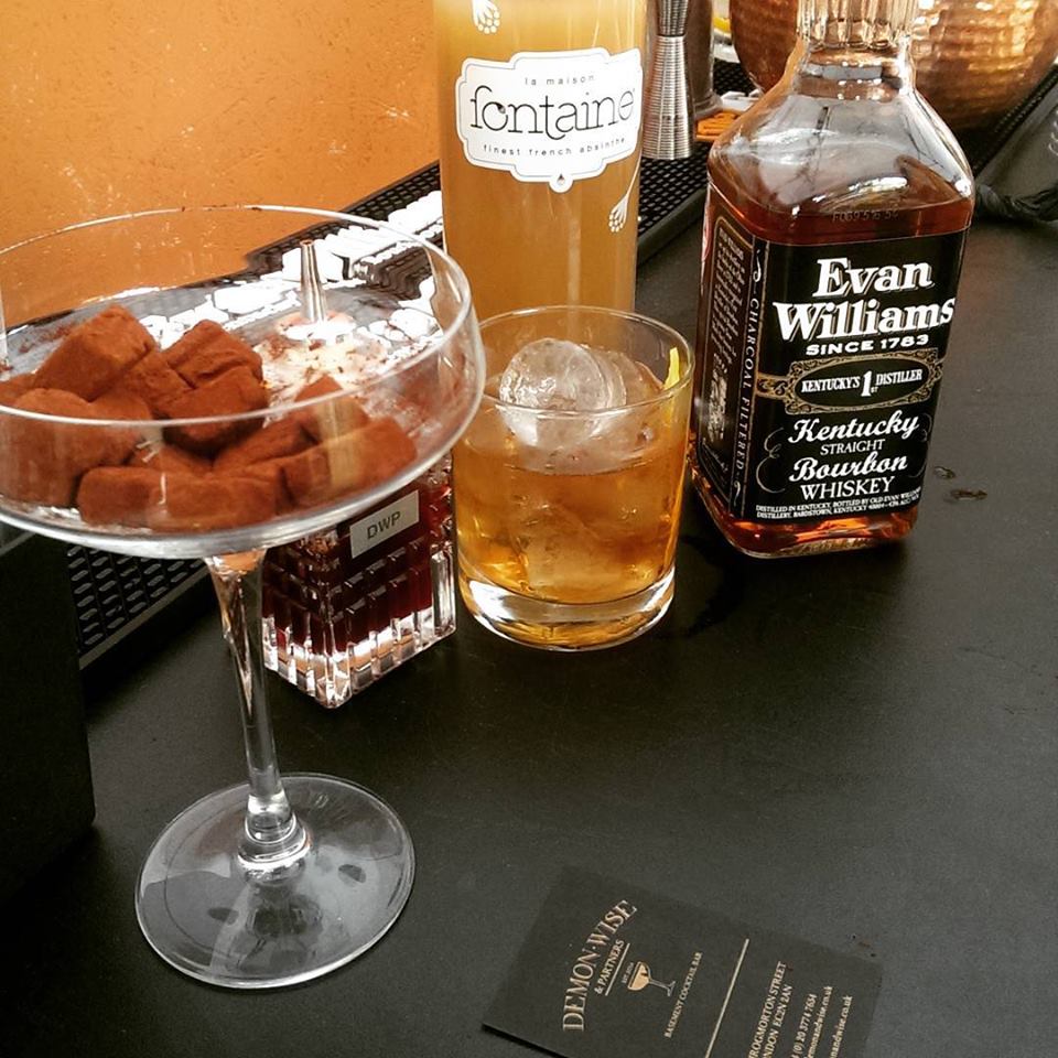 Recently opened City basement bar Demon, Wise and Partners swaggered in with their Extra Aged Demon : Evan Williams Extra Aged Whiskey, Chocolate Absinthe Liqueur, Demon, Wise and Partners Bitters. This cocktail just screams DWP, it is so reminiscent of their bar style, with focus on continental flavours less expressed here, bitter aniseed fascinations. Paired with cocoa dusted chocolate truffles, this bourbon muscles in with leather and brown sugar, accentuated by the chocolate, the absinthe liqueur kicking it down to size with some spice from the bitters. More of an indoor cocktail, but one we could relax with on the grass away from the crowd.